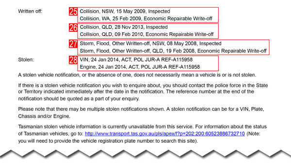 25 & 26. Collision - Inspection (Different state to the write off). In some states, sellers are not required to disclose that the vehicle was written off if that write off occured in another state. For fraudulent sellers, they may purchase a vehicle interstate and resell it in another. If you do not see an "Inspected" notice in your report, it means exactly this, the vehicle has not been inspected by someone and approved to be "road worthy" thus registered in that state or territory. You must have the vehicle inspected prior to registration.